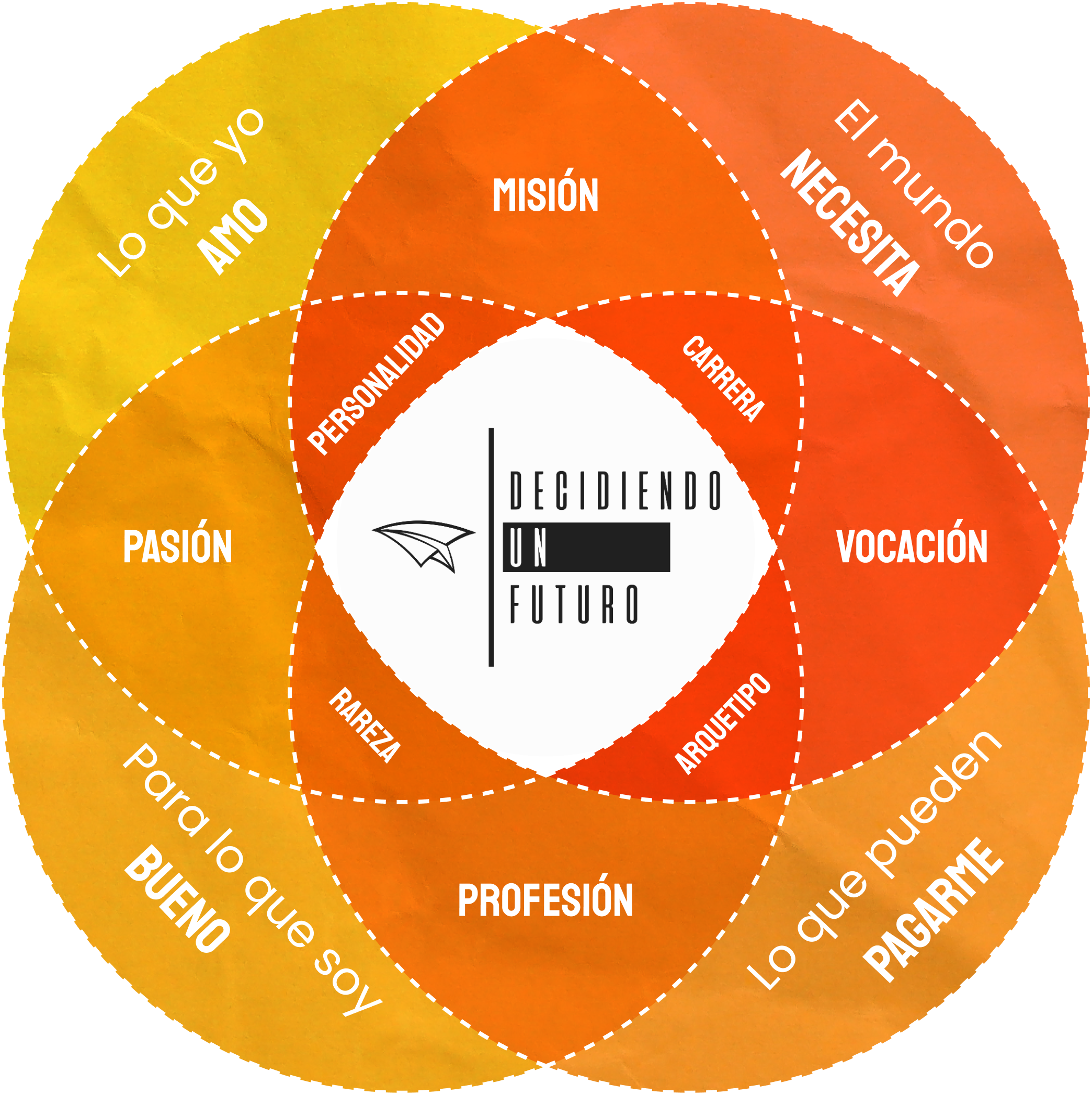Este es un excelente inicio pero conforme nos vamos acercando al centro todo se va volviendo más complicado, tu pasión se encuentra al combinar lo que amas y en lo que eres bueno, tu profesión es lo que pueden pagarte y en lo que eres bueno, tu vocación es lo que el mundo necesita y pueden pagarte, mientras que tu misión es lo que amas y el mundo necesita.